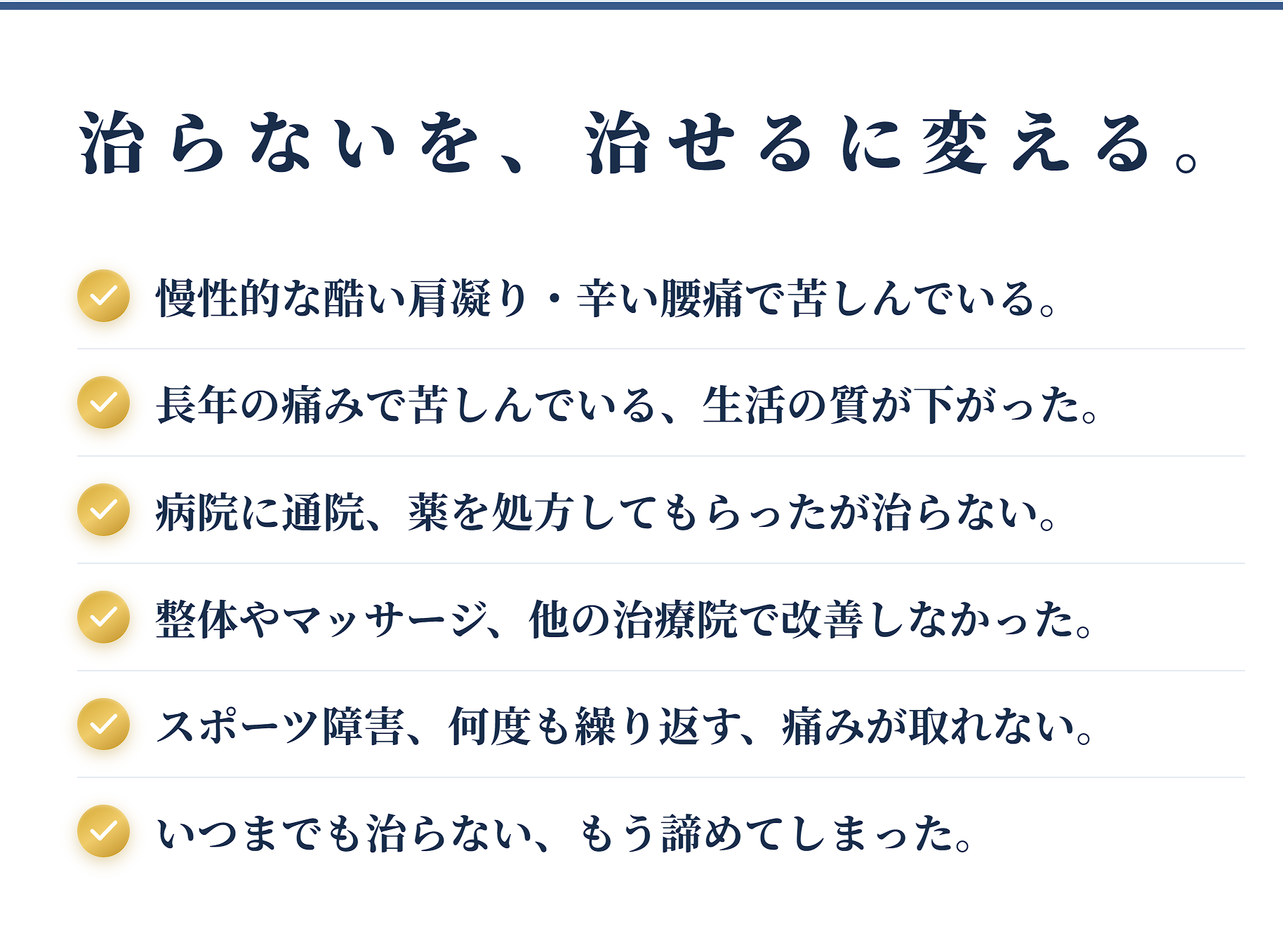 「治らない痛み」「改善しない症状」に、結果で応えます。