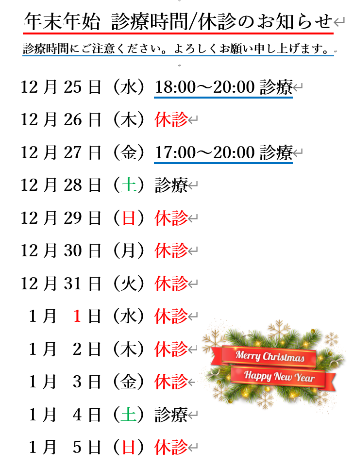 年末年始 診療時間/休診のご案内です。年末はラグビー全国大会等帯同の為、変則的な診療時間となります。よろしくお願い申し上げます。 肩こり 腰痛 関節痛 神経痛 スポーツ外傷 交通事故治療は、守谷市ひがし野整骨院にお任せ下さい。整体 矯正 ストレッチ 匠の技術による手技と最新治療器で痛みの早期改善に努めます。
