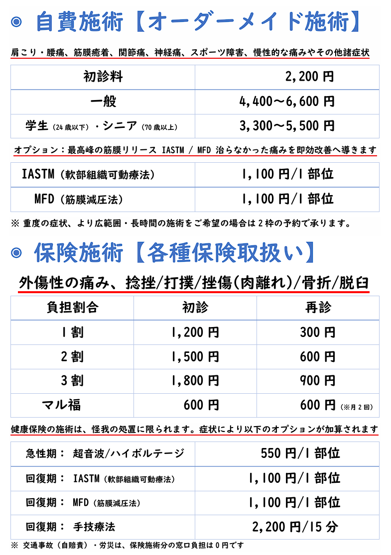 日頃より当院をご愛顧いただき、心より感謝申し上げます。 この度、**「治らないを治せるに変える」**という使命を果たすため、最高峰の特殊技術 IASTM/MFD(筋膜リリース)を導入いたしました。 これに伴い、当院が提供する「匠の手技」と最高峰の技術への対価として、令和8年1月5日より料金体系を改定させていただきます。 ![]() 料金改定の主な点
